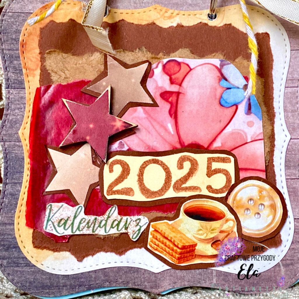 Najpierw chciałabym pokazać Wam okładkę tego kalendarza w technice scrapbookingu na 2025 rok. Okładka ta ma jakże neutralną, stonowaną kolorystykę w ciepłych odcieniach brązu i czerwieni, chciałam bowiem, aby od początku emanowała spokojem. Na jej środku widnieje zapewne najważniejsza treść liczba „2025”, odbita za pomocą stempelków w ciepłym brązowym kolorze, a pod nią słowo „Kalendarz”. Dodatkową ozdobę stanowią delikatne grafiki: gwiazdy, guziki oraz filiżanka herbaty, które nadają projektowi przytulny, domowy klimat.