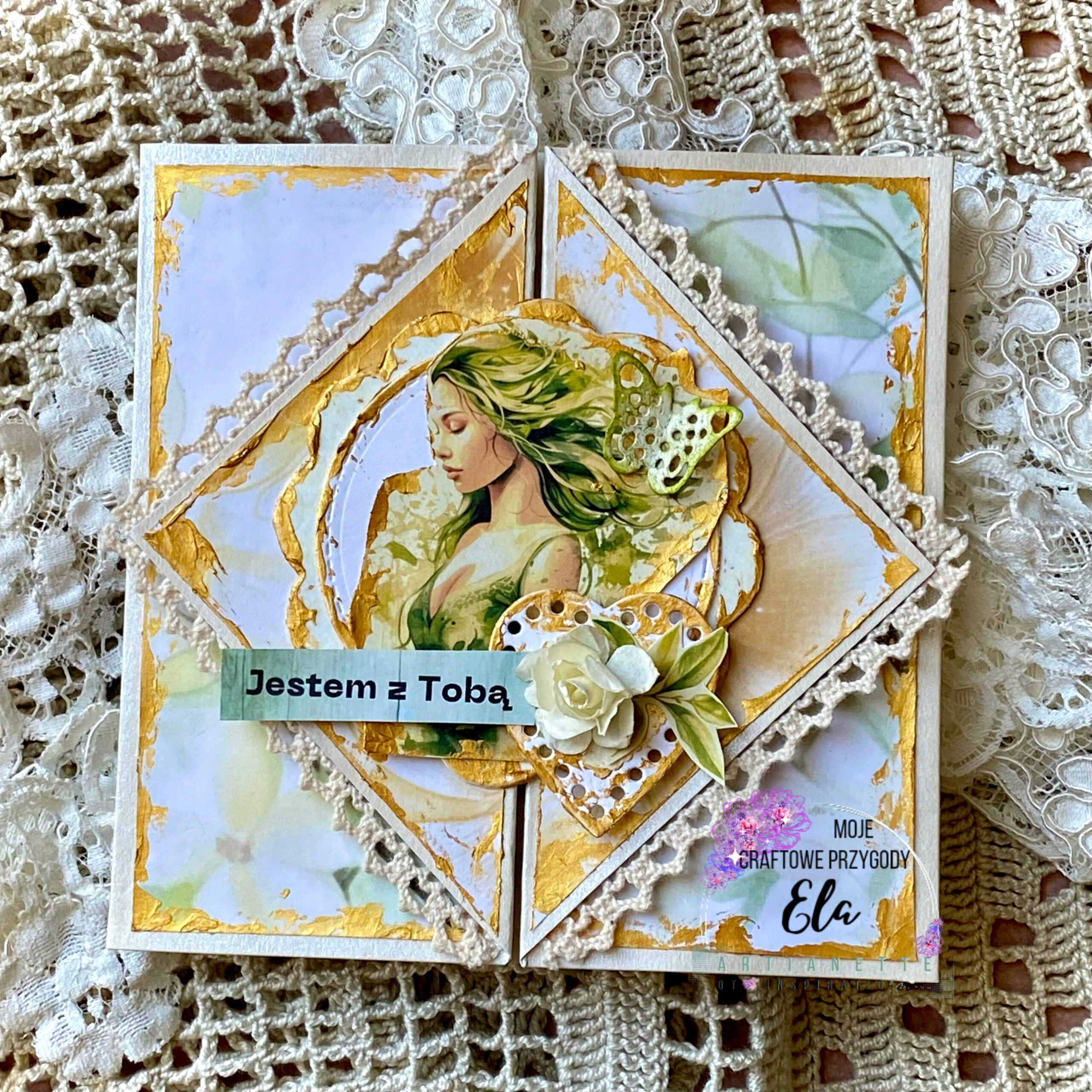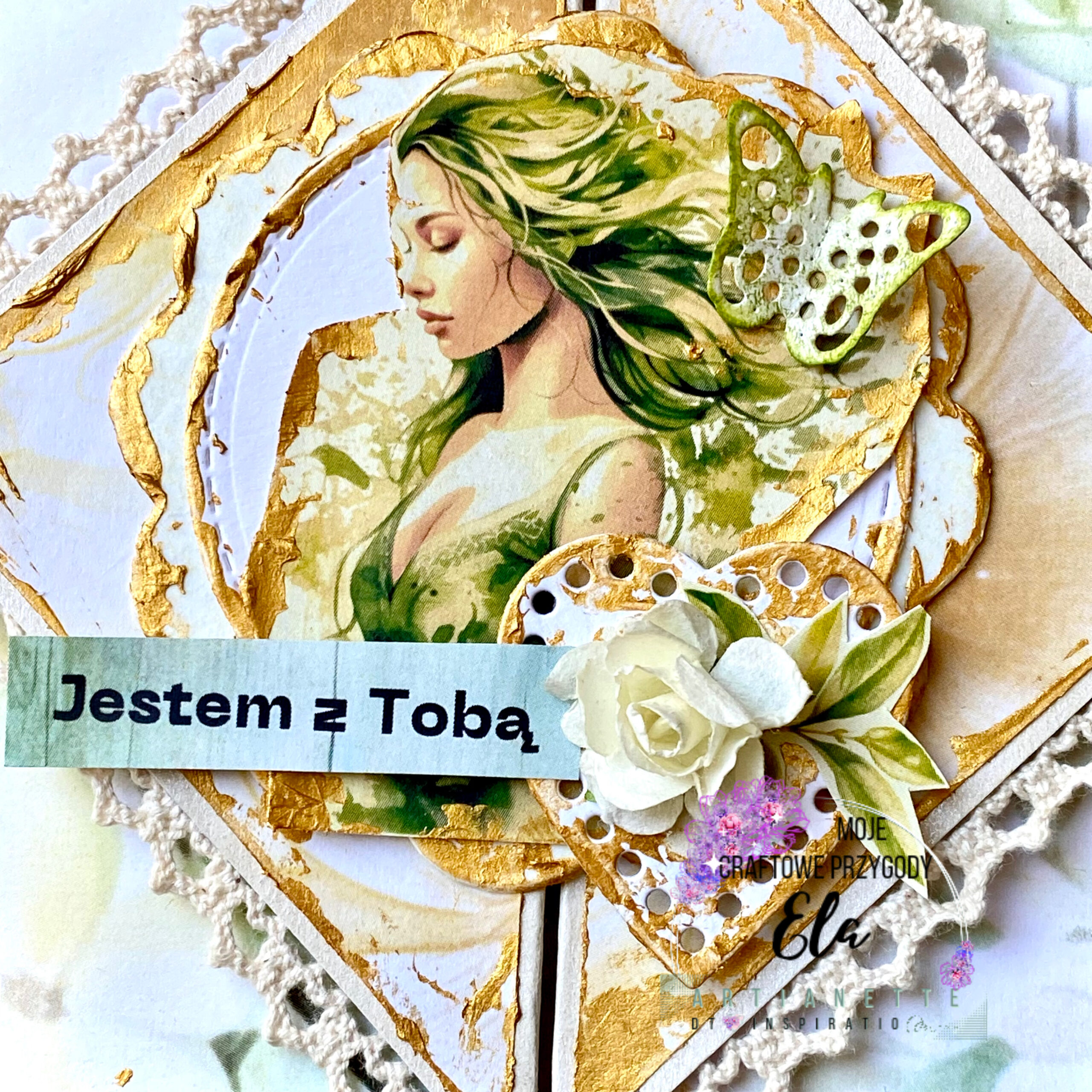 Złota pasta strukturalna delikatnie przyprószyła całość, nadając jej jeszcze więcej elegancji. Poza tym na dolnej części kartki znalazł się napis „Jestem z Tobą”. Umieściłam go na zielonym tle, co podkreśla głębię przekazu. W ten sposób kartka okiennica nie tylko pięknie wygląda, ale także niesie ważne przesłanie. Taka kartka jest doskonałym wyborem na wiele okazji.