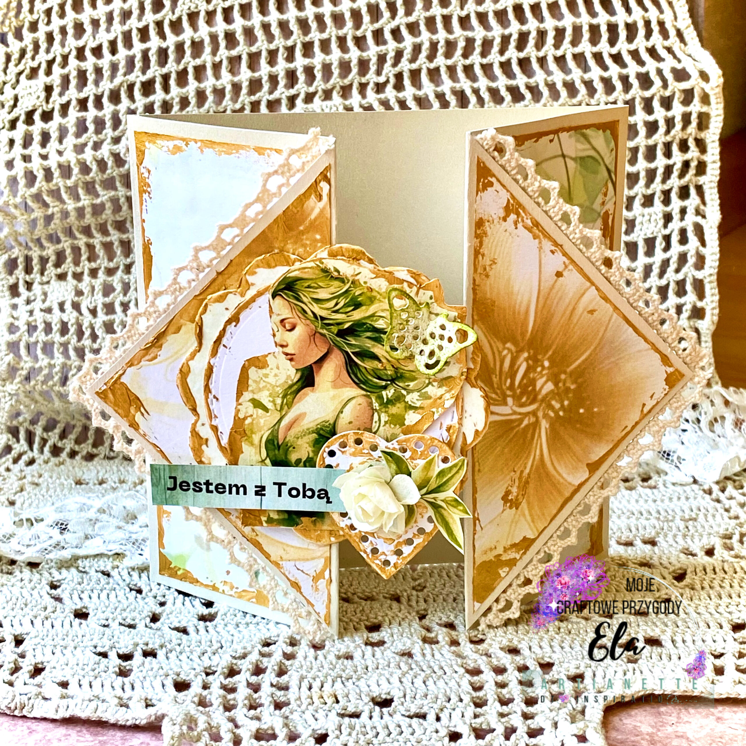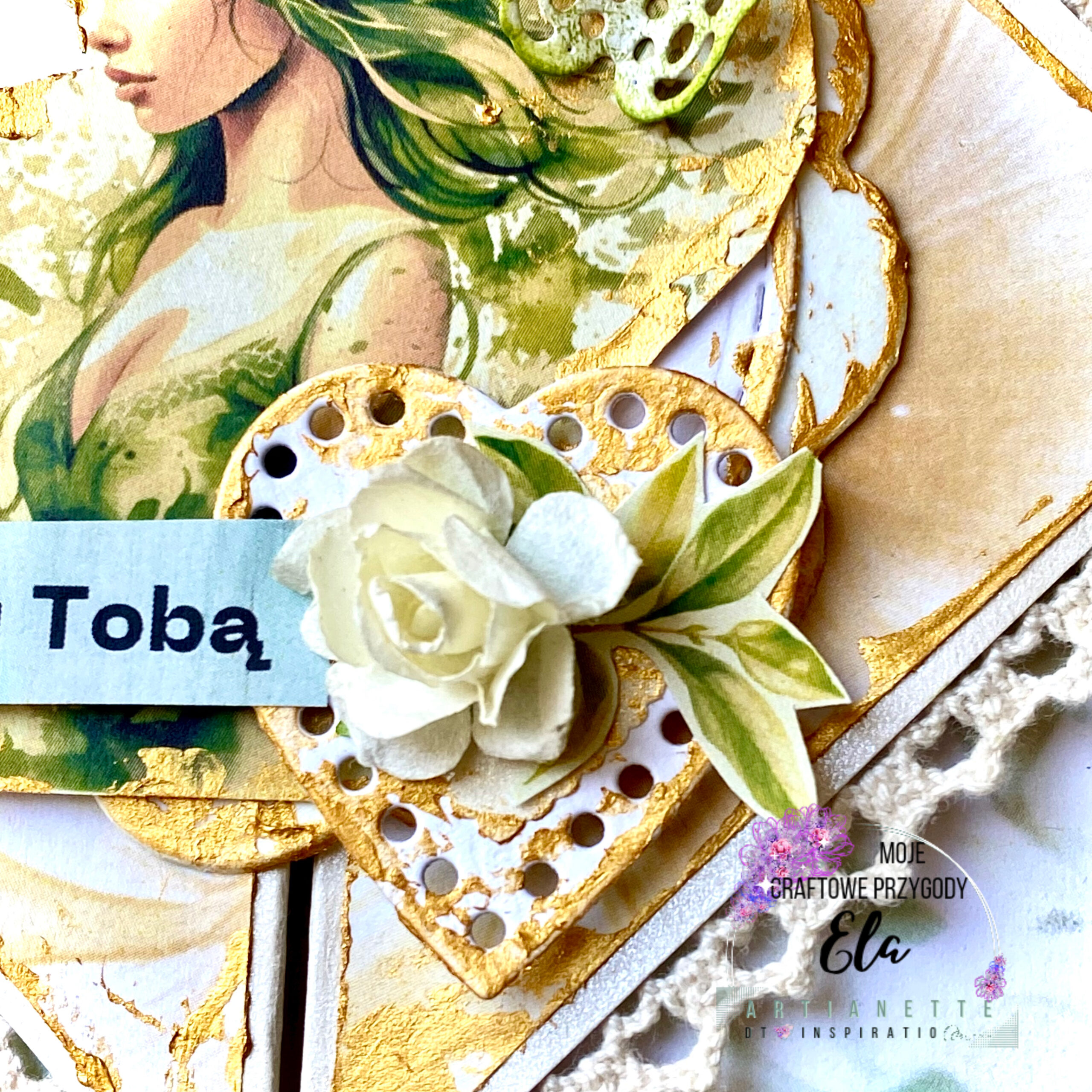 Do stworzenia bazy kartki użyłam kremowego i beżowego papieru. Z kolei papiery z kolekcji Artianette Spring Breath oraz White Celebration dodały jej elegancji. Ważnym elementem dekoracyjnym jest delikatna koronka, umieszczona wzdłuż brzegów. Nadaje ona kartce vintage’owego wyglądu. Także zielone liście, ażurowe serce, motyl oraz kremowa róża wprowadzają trójwymiarowe akcenty. Warto zauważyć, że wszystkie te detale harmonizują z centralnym motywem, nie przytłaczając go.