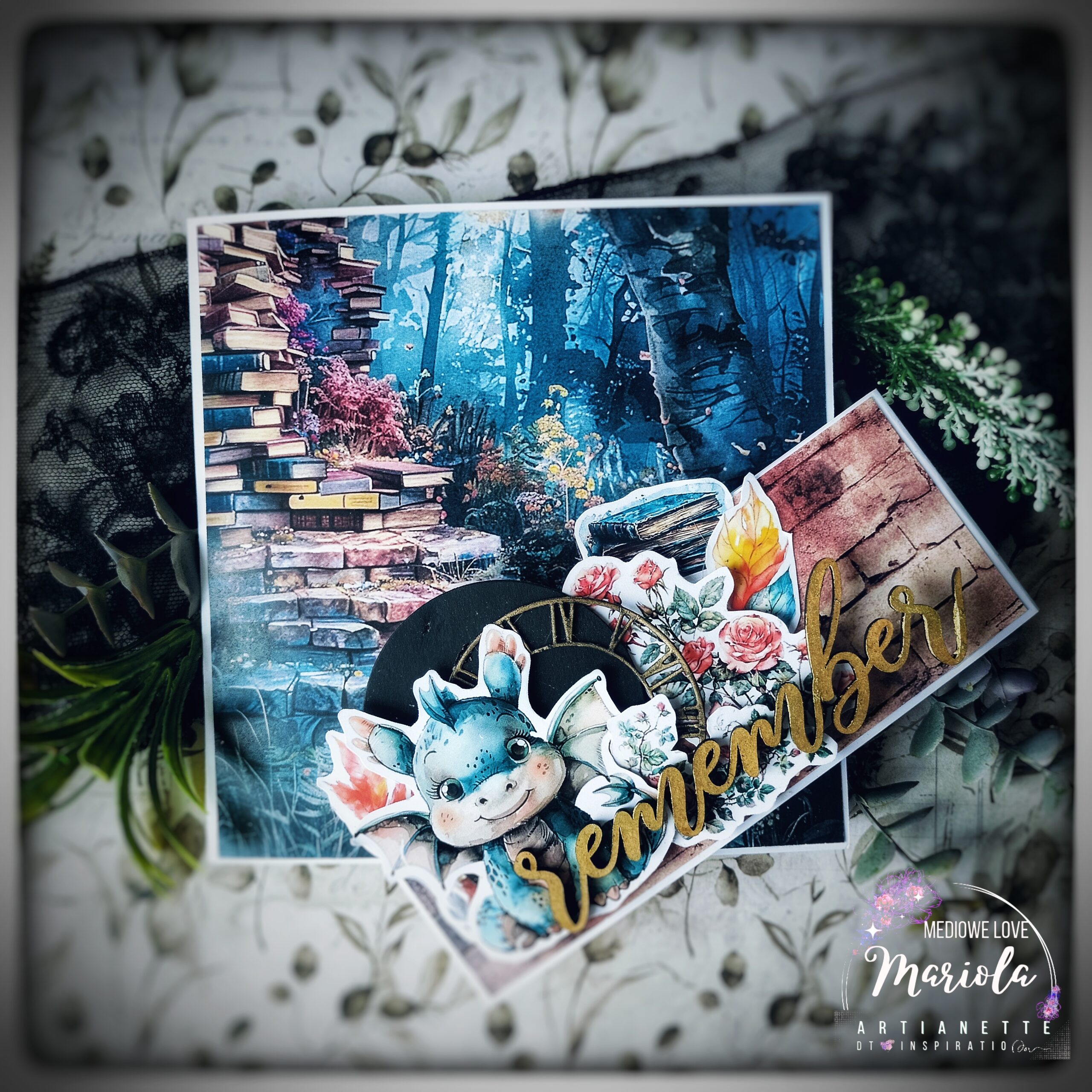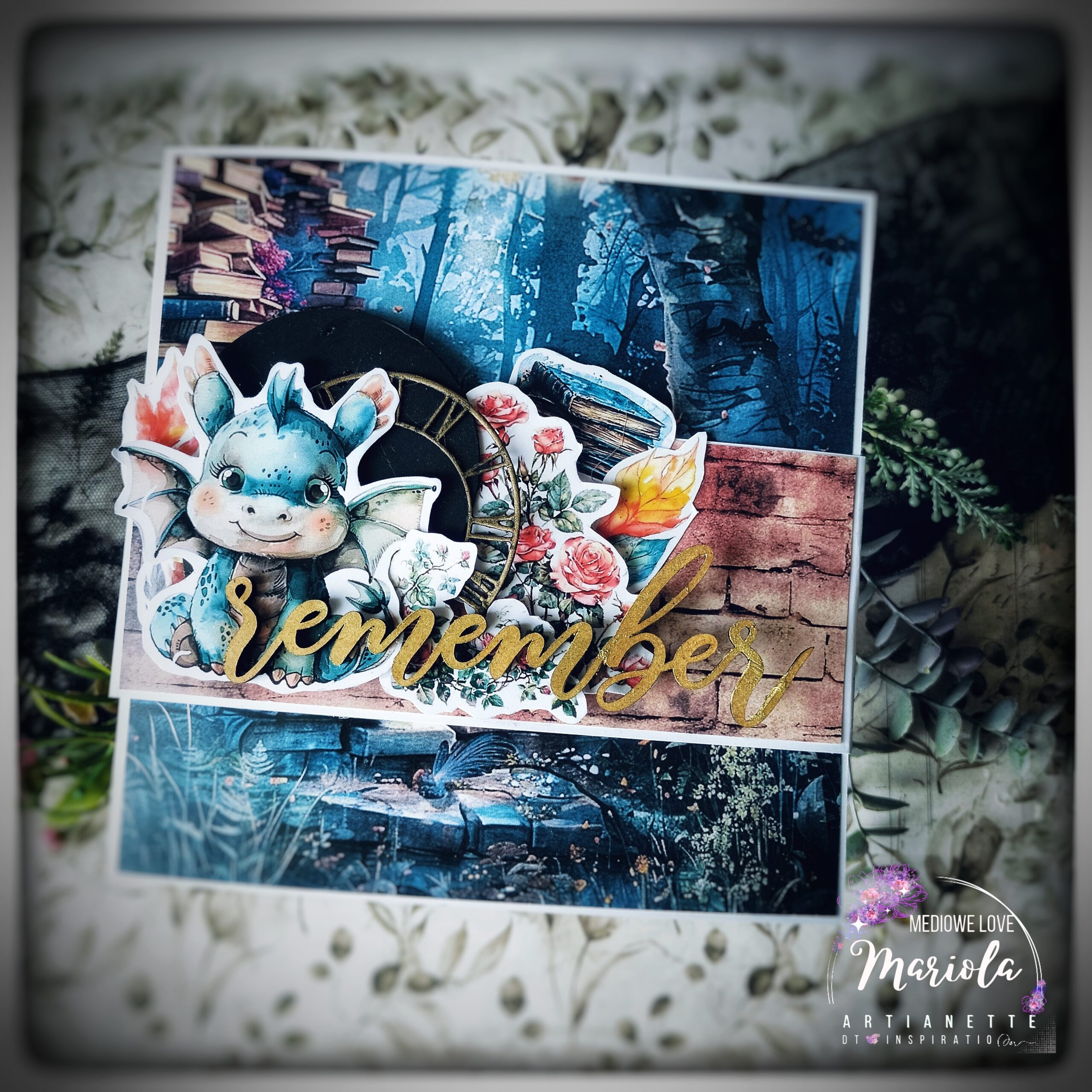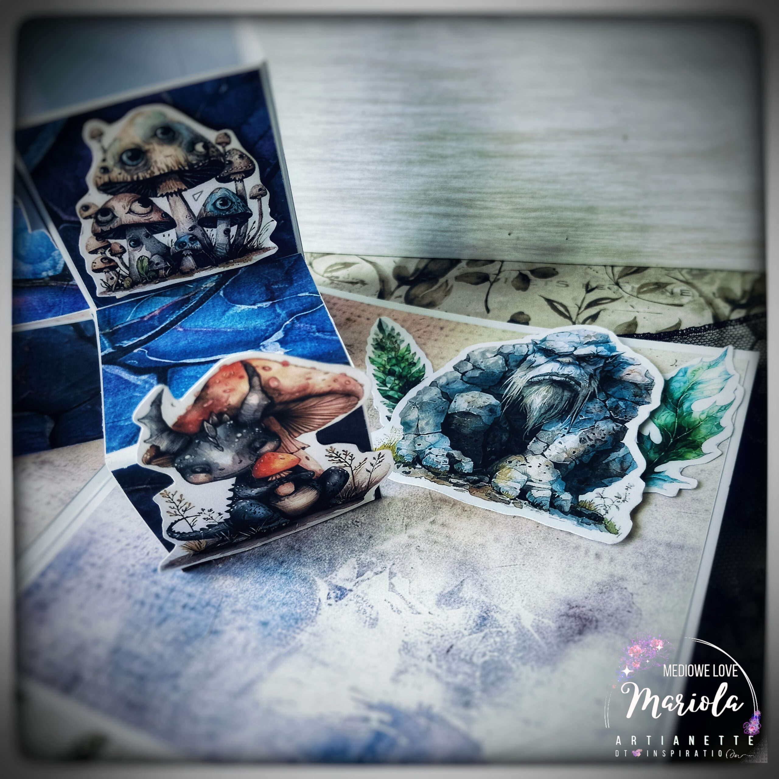 Na ściankach kostek kartki pop-up triple cubes umieściłam urocze grafiki smoków, trolli oraz skrzatów. Te elementy dodają kartce bajkowego klimatu. Nie zabrakło też fantazyjnych grzybków oraz skrzyni skarbów, co podkreśla tematyczną spójność projektu. Wszystkie te elementy tworzą harmonijną i kolorową kompozycję, która przyciąga wzrok i pobudza wyobraźnię. W ten sposób stworzyłam spójną i ciekawą kompozycję. Oprócz tego, chciałam, aby kartka miała bajkowy klimat.