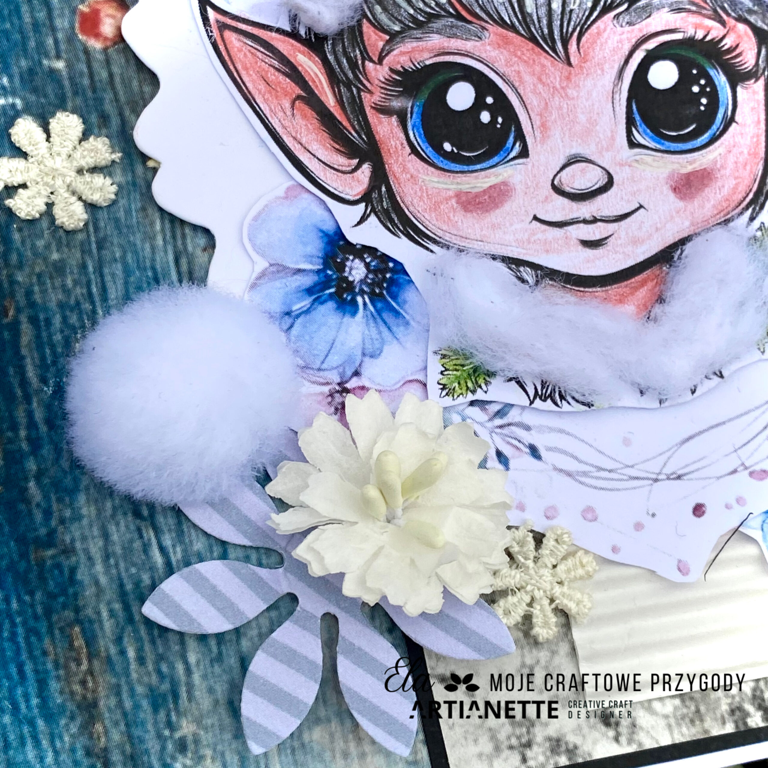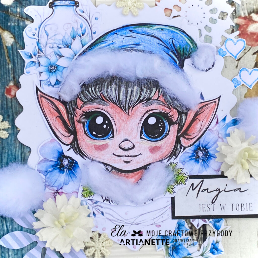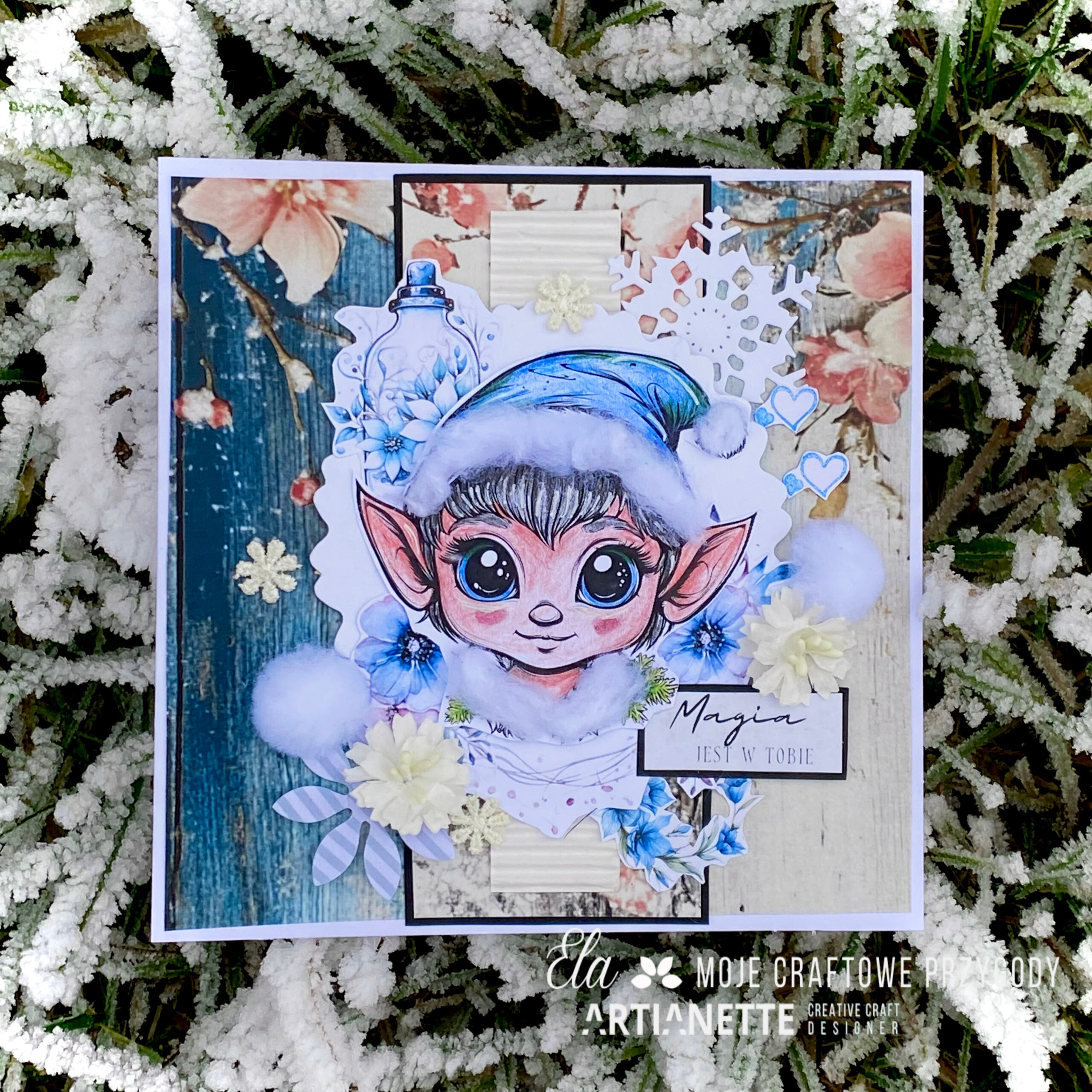 Witajcie! Dziś zapraszam Was na trochę zimowej magi. Poniżej zobaczycie, że zainspirowałam się Digistemplem z elfem, który był gratisem na naszej grupie inspiracyjnej Artianette Inspire. Tak oto postała magiczna kartka z elfem 🙂
