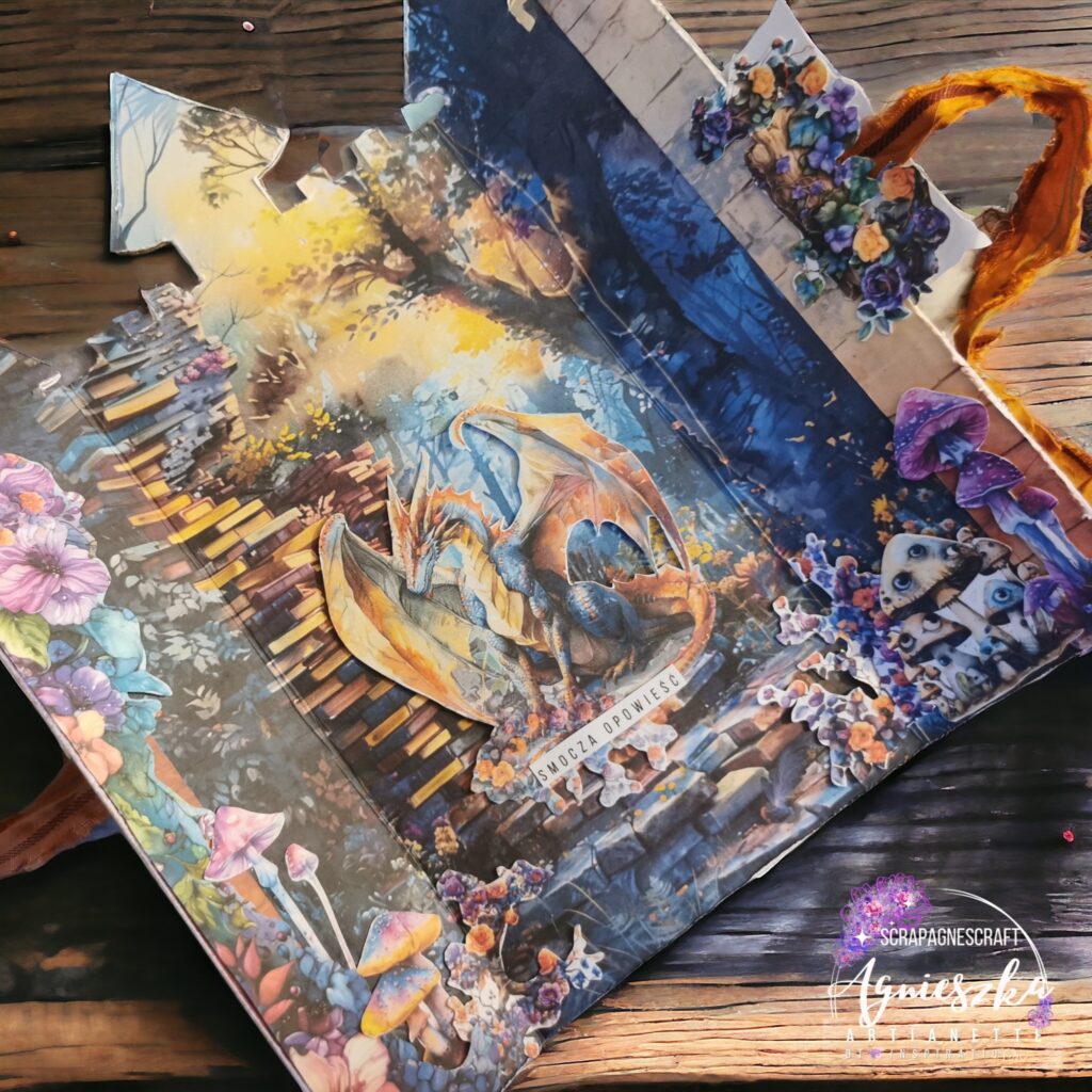 Kartka otwiera się jak okiennica, odkrywając kolejne tajemnice. Na jednej klapce widnieje smok z napisem: „W skrzydłach smoka kryje się siła”, a na drugiej dałam napis: „W sercu smoka kryje się magia”. To właśnie te magiczne słowa mają przypominać o ukrytej mocy i magii, która drzemie w każdym z nas. To przesłanie, które pragnęłam przekazać.