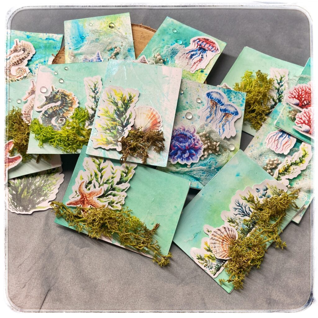 Następnie wprowadziłam elementy mediowe. Użyłam gazy, która symbolizuje sieci rybackie lub mgłę. Gazę można przymocować do tła za pomocą medium akrylowego lub kleju do decoupage. Po wyschnięciu, delikatnie pomalowałam ją akwarelami lub mgiełkami w sprayu. Dzięki temu harmonizuje z tłem. Kolejnym elementem kompozycji jest mech. Dodaje on tekstury i naturalności kartom. Mech można przykleić punktowo. W ten sposób tworzymy kompozycje przypominające małe wyspy porośnięte zielenią. Oplątwa, czyli tillandsia, to ciekawy dodatek. Jej delikatne, srebrzyste listki wprowadzą elegancję i tajemniczość. Ponadto, te elementy dodają trójwymiarowości morskim kartom ATC. A zatem, użyłam różnych elementów, aby urozmaicić karty.