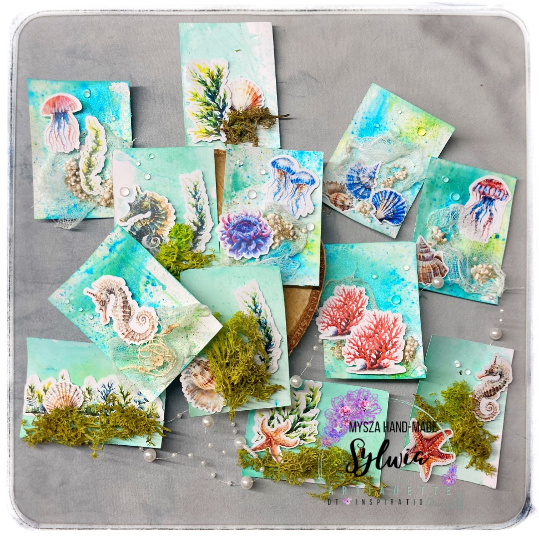 Z tej strony Sylwia. Dzisiaj zapraszam was na kolejną inspirację. Powoli zaczynam czuć wakacje. A kiedy w sklepie pojawiła się kolekcja deep ocean, usłyszałam szum morza. Dla mnie wakacje to tylko nad morzem. Zaczęłam więc małe przygotowania. Postanowiłam wykonać serię morskich kart ATC z mediowym tłem. Ta seria liczy 12 prostych kart. Każda z kart symbolizuje jeden dzień mojego pobytu nad morzem. Dlatego każda z kart jest wyjątkowa.
