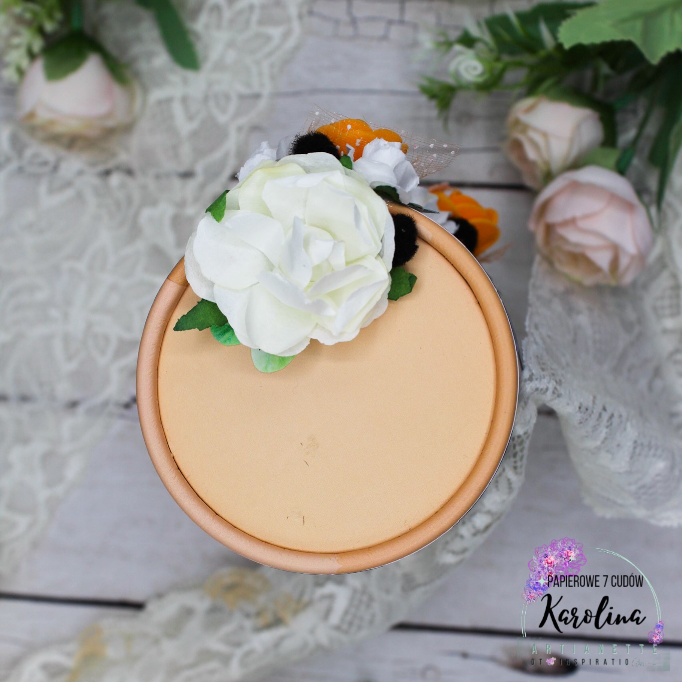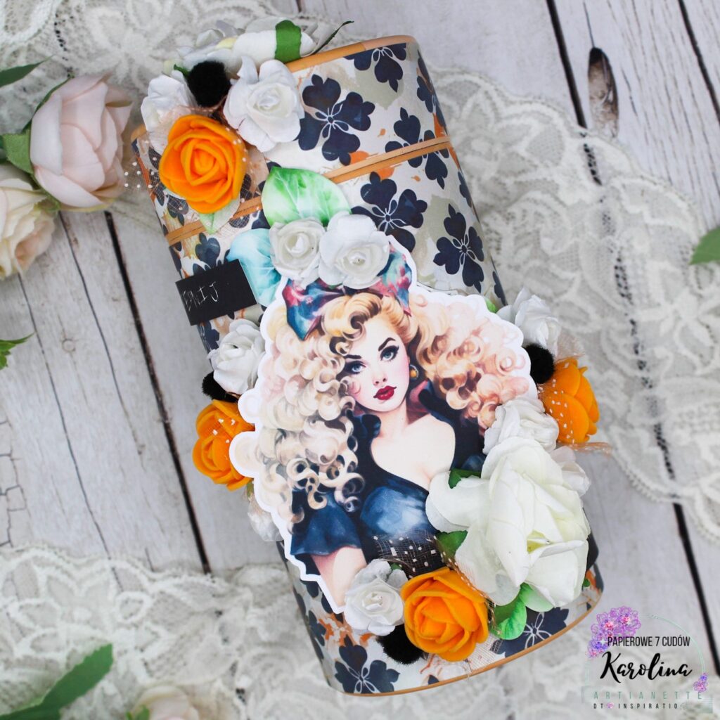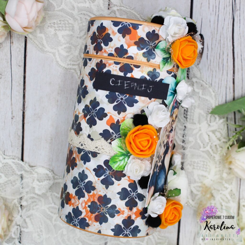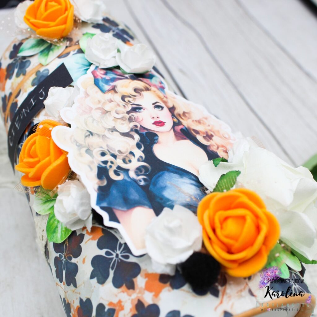 Efektem mojej pracy jest nietypowa śląska skarbonka, którą ozdobiłam cyfrowym arkuszem papieru w kolorze kremowo-pomarańczowym z czarnymi ornamentami. Ten wybór kolorów nadał śląskiej skarbonce ciepły i przytulny wygląd, a czarne ornamenty dodały jej elegancji. Centralnym punktem skarbonki jest grafika przedstawiająca panią z jasnymi lokami, otoczoną pięknymi kwiatami w odcieniach pomarańczowym, białym i kremowym.
