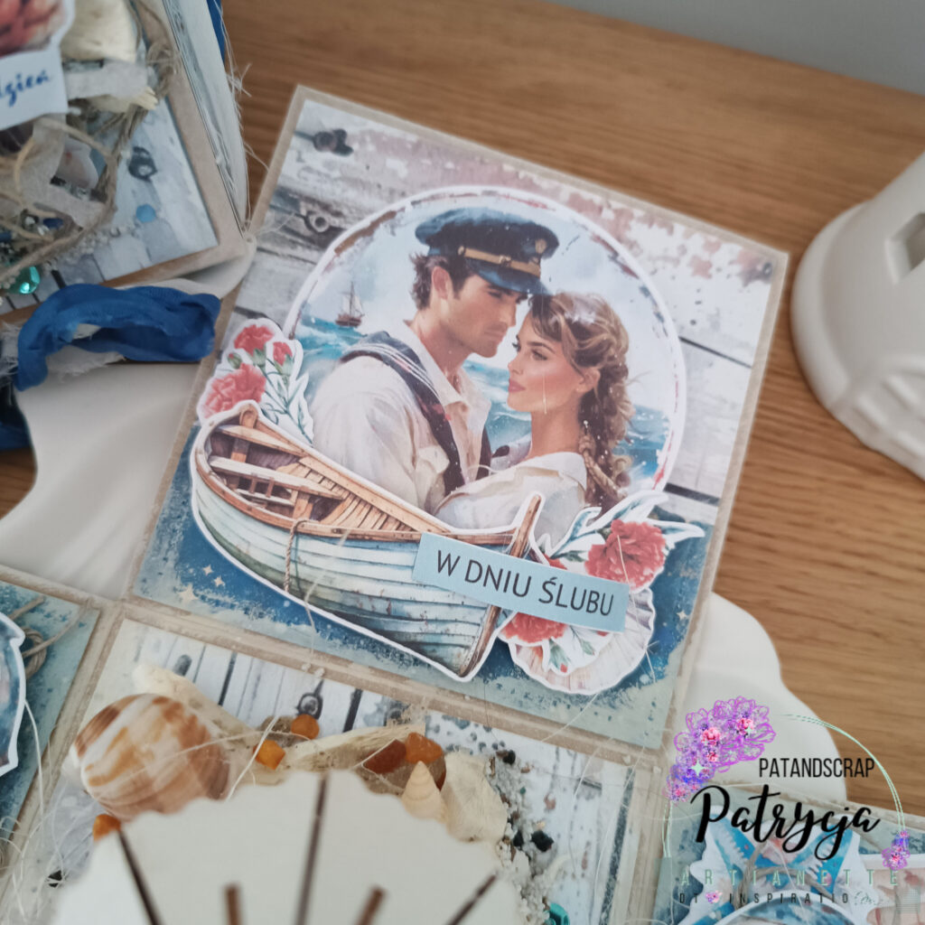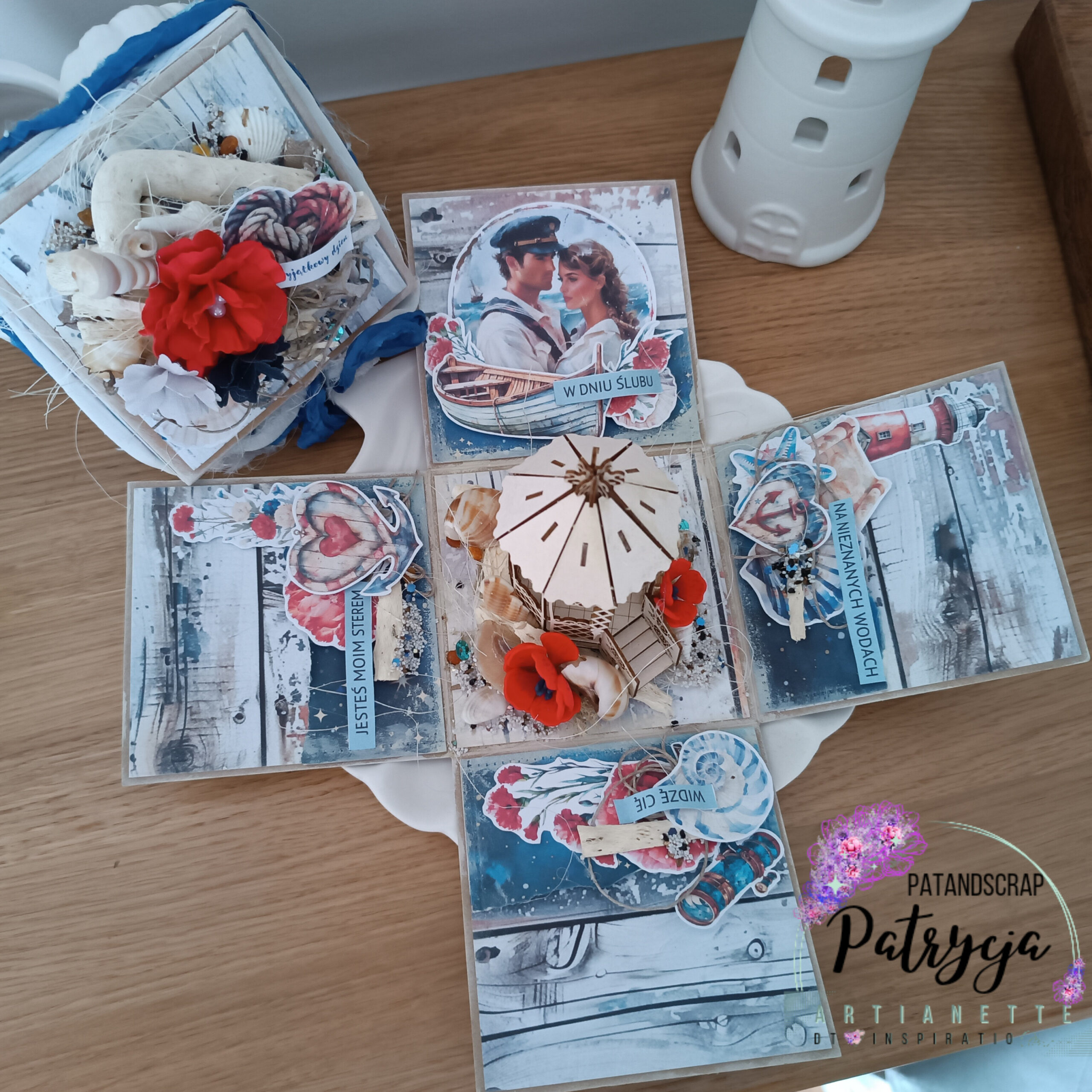 Zanim zaczęłam pracę, dokładnie zaplanowałam każdy element pudełka. Następnie wycięłam i złożyłam bazę exploding boxa, a potem zaczęła się najprzyjemniejsza część – dekorowanie. Po pierwsze, na wieczku umieściłam uroczy obrazek z parą młodą, a w środku – trójwymiarową latarnię morską. Po drugie, na ściankach pudełka znalazły się motywy kotwic, muszelek i lin, które idealnie pasują do marynistycznego stylu. Co więcej, dodałam też kilka sentymentalnych napisów, które podkreślają miłosny charakter prezentu.