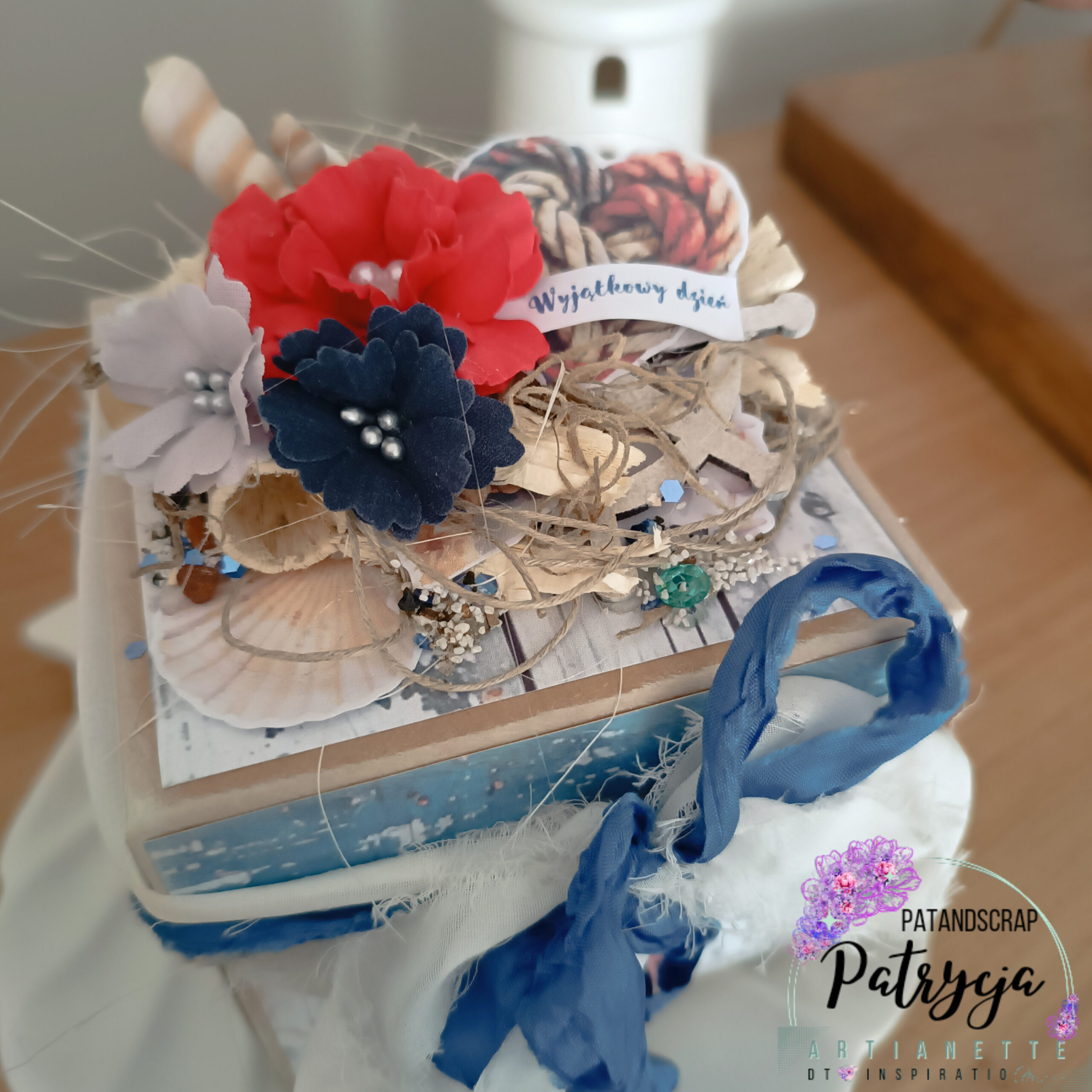 Inspiracją do stworzenia tego pudełka była oczywiście miłość i morze. Ponieważ uwielbiam marynistyczne motywy, od razu wiedziałam, że chcę wykorzystać papiery z kolekcji Marine Love marki Artianette. Te papiery są po prostu stworzone do takich projektów! Mają piękne wzory, które idealnie oddają klimat morskiej przygody. Oprócz tego, są bardzo dobrej jakości, co jest dla mnie niezwykle ważne.