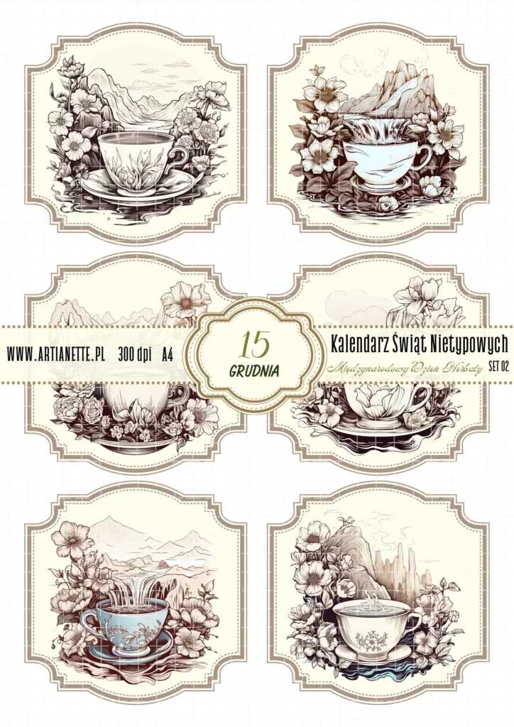 Centralnym punktem kartki jest grafika herbacianki. Otóż grafika pochodzi z setu DZIEŃ HERBATY 02, autorstwa Artianette. W dodatku przedstawia filiżankę herbaty otoczoną delikatnymi kwiatami, co tworzy harmonijną i relaksującą kompozycję. Ponieważ rysunek jest szczegółowy, więc budzi nostalgię, przenosząc nas w świat spokojnych chwil spędzonych przy filiżance ulubionego napoju. W rezultacie przywołuje chwile spędzone na rozmowach z bliskimi, a także podkreśla wartość prostych, codziennych przyjemności