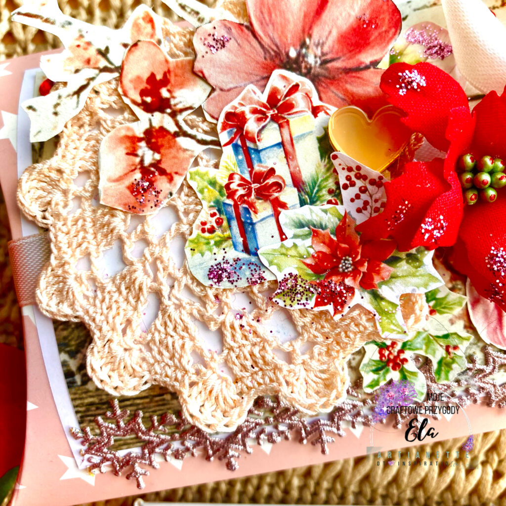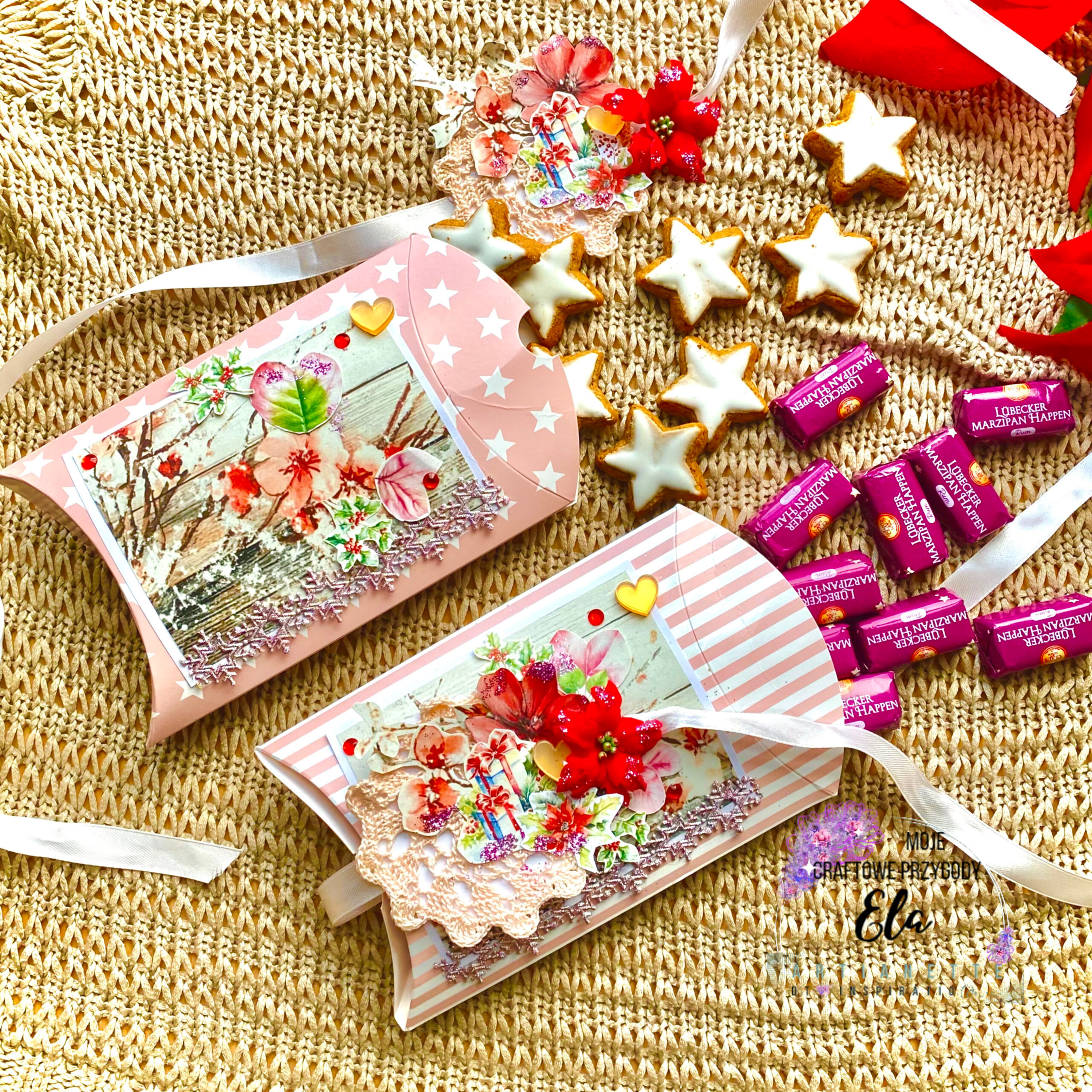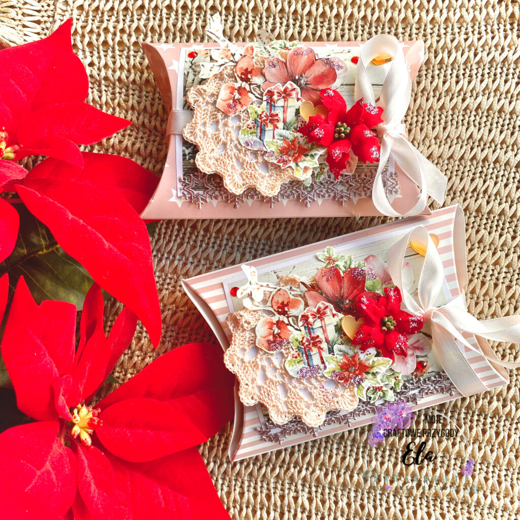 Do świątecznego charakteru pudełek nawiązują także czerwone kwiaty poinsecji, które kontrastują z różową bazą, wprowadzając głębię kolorów i ożywiając całą kompozycję. Są to zarówno grafiki poinsecji jak również kwiaty z materiału.
