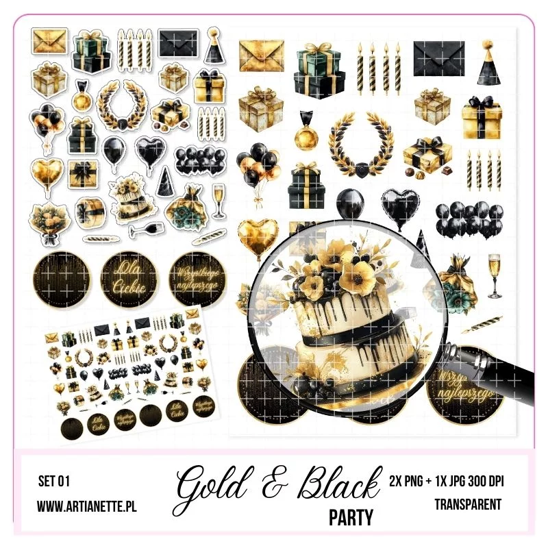 złoto czarna kartka na urodziny scrapbooking z papierów Artianette, digi do wycinania Gold&Black Party, inspiracja DT Alfreda