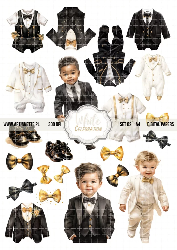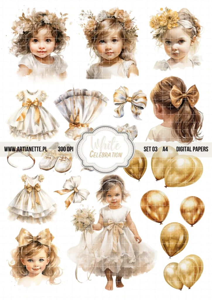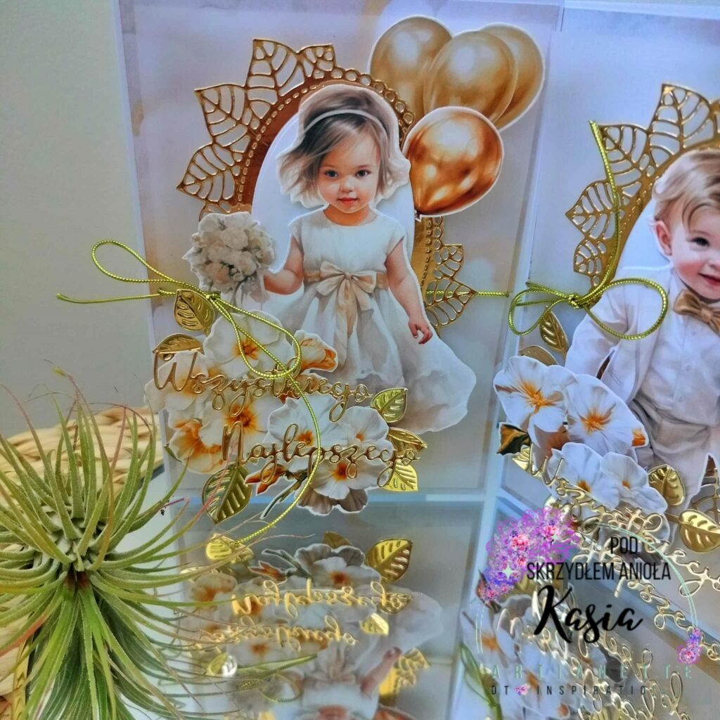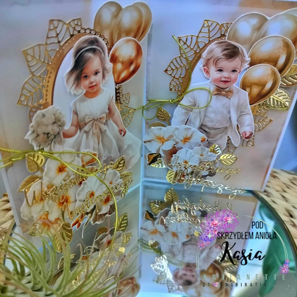 Wykorzystałam grafikę przedstawiającą urocze dzieci, aby dodać kartkom ciepły, serdeczny charakter. Oprócz tego, dołączyłam delikatne kwiaty, które wniosły do projektu świeżość i lekkość. Te elementy sprawiły, że urodzinowe kartki dla dzieci stały się pełne uroku i subtelności. Kolory, które wybrałam, miały dla mnie ogromne znaczenie. Biel symbolizuje czystość i niewinność dzieci, doskonale wpisując się w atmosferę urodzin. Złoto dodało kartkom elegancji i wytworności, sprawiając, że prezentują się one bardziej wytwornie. Kalkę kreślarską użyłam, aby nadać kartkom lekko nostalgiczny charakter, co czyni je jeszcze bardziej wyjątkowymi.