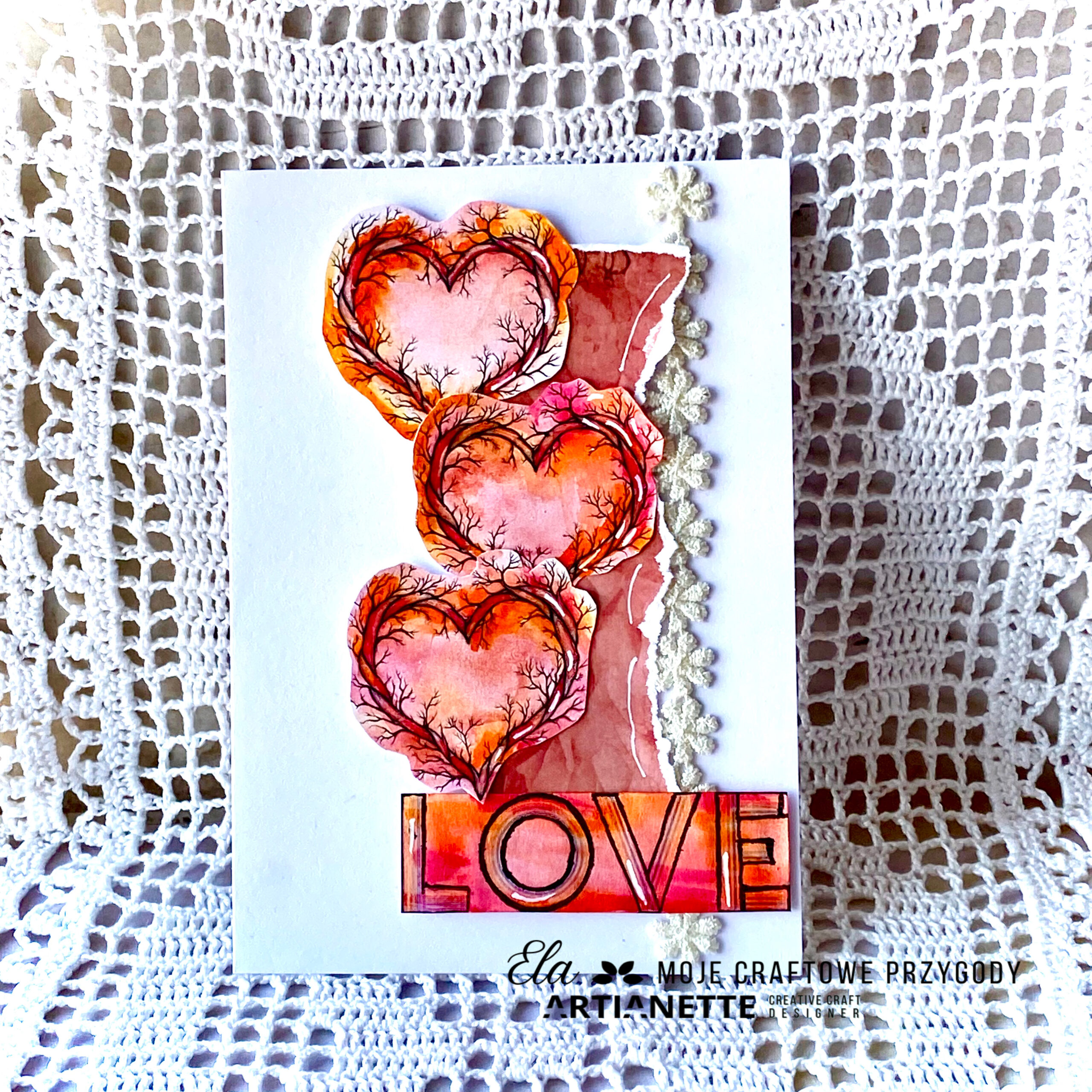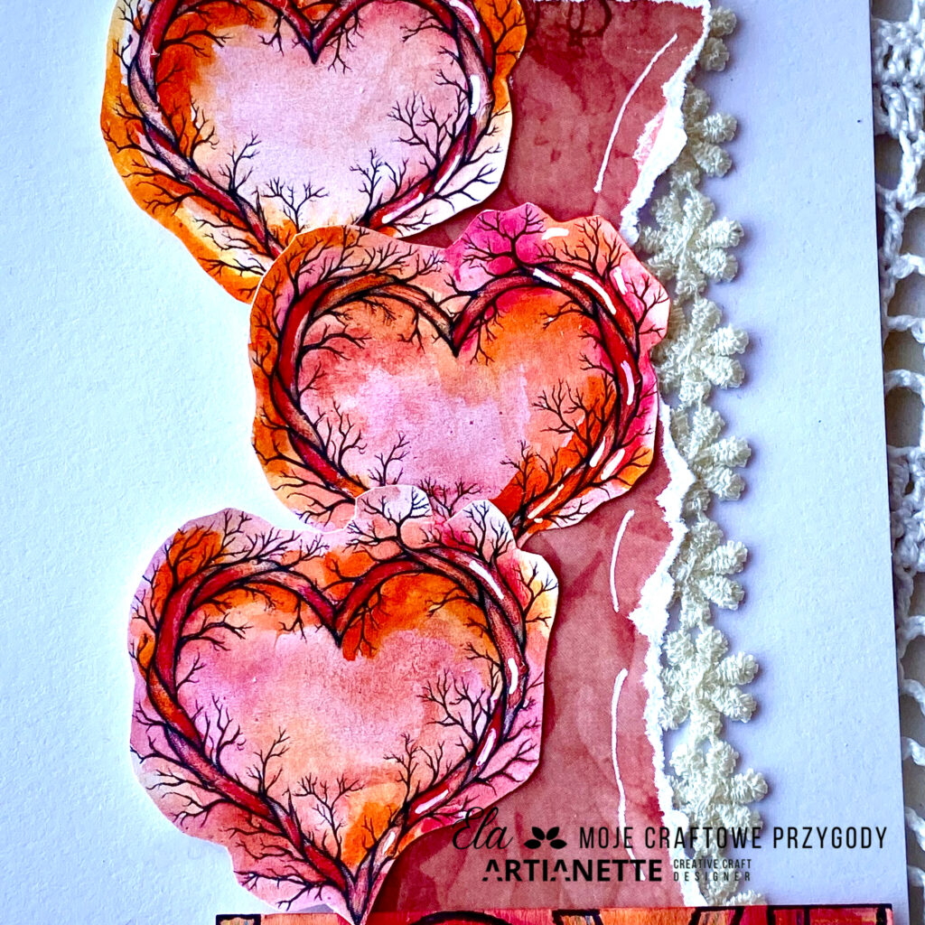 Trzy warstwowe walentynkowe serca dodają kompozycji przestrzenności, zaś nieregularne krawędzie nadają jej artystycznego charakteru. Dodatkowo zastosowana tekstura koronki po prawej stronie kartki wprowadza element vintage, podkreślając romantyczny i delikatny styl projektu. Serca pomalowałam najpierw farbami akwarelowymi. Następnie, po wyschnięciu, użyłam także pisaków akwarelowych oraz białego żelopisu. Na koniec wszystkie serca starannie wycielam i umieściłam na pasku czerwonego papieru z kolekcji. Wydzierany brzeg nadaje tej kompozycji jakże oryginalnego charakteru.